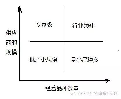 按供應商的規(guī)模和經營品種分類,常以供應商的規(guī)模作為縱坐標,經營品種數量作為橫坐標進行矩陣分析。