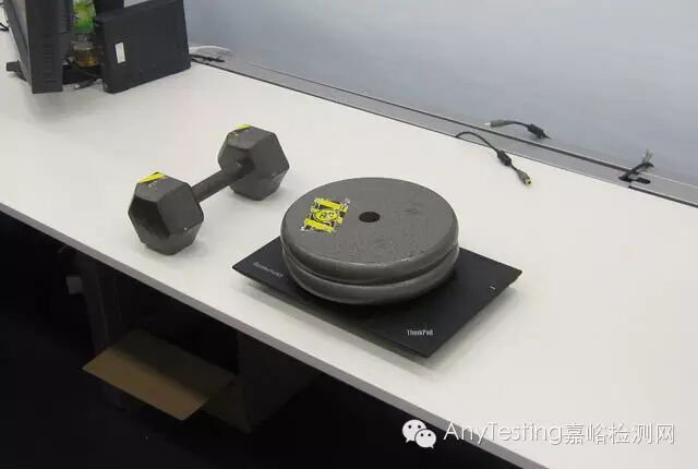 16、這兩個鐵質的重物,一個普通的女生雙手抬起來會有些吃力,將它們壓到筆記本上,也是實驗的內容之一。