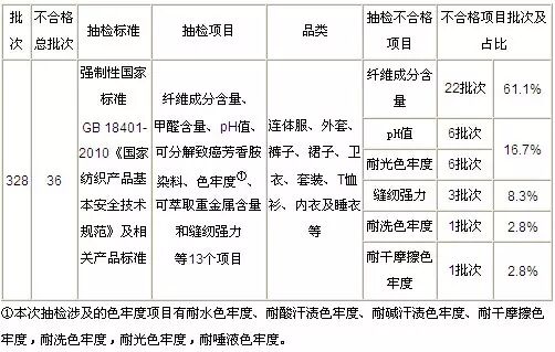 國(guó)家質(zhì)量監(jiān)督監(jiān)督檢驗(yàn)檢疫總局于2015年1月6日發(fā)布了2014年兒童及嬰幼兒服裝產(chǎn)品質(zhì)量全國(guó)聯(lián)動(dòng)監(jiān)督抽查結(jié)果,共抽查了北京、河北、安徽、福建、江西、河南、湖北、廣東、四川、云南等10個(gè)省、直轄市326家企業(yè)生產(chǎn)的328批次兒童及嬰幼兒服裝產(chǎn)品,共發(fā)現(xiàn)36批次不合格。